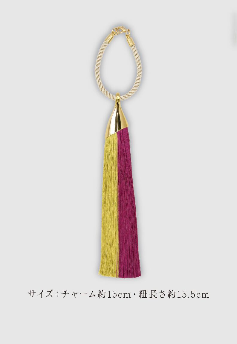 丁寧に束ねられたタッセルと上品な金具の組み合わせが、 装いに華やぎを添えます。